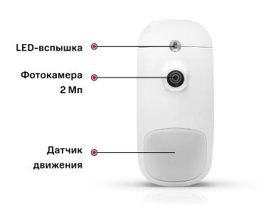 Беспроводной датчик движения с функцией фотофиксации реагирует на тепловое излучение движущегося человека и отправляет сигнал тревоги вместе с фото о событии на Центральную станцию мониторинга. Снимки доступны оператору только по тревоге - они позволяют определить точную причину срабатывания и дать нужные инструкции группе быстрого реагирования. Датчик делает фотоснимки при любом освещении, даже ночью. Умное устройство не реагирует на движение домашних питомцев весом до 25 кг, поэтому их перемещение по дому не станет причиной ложной тревоги.